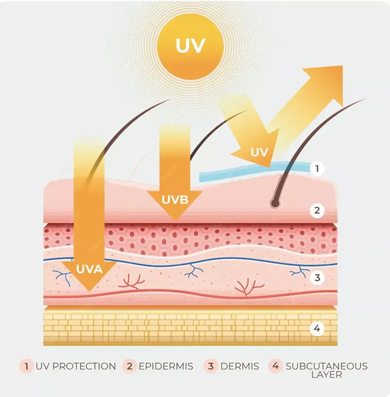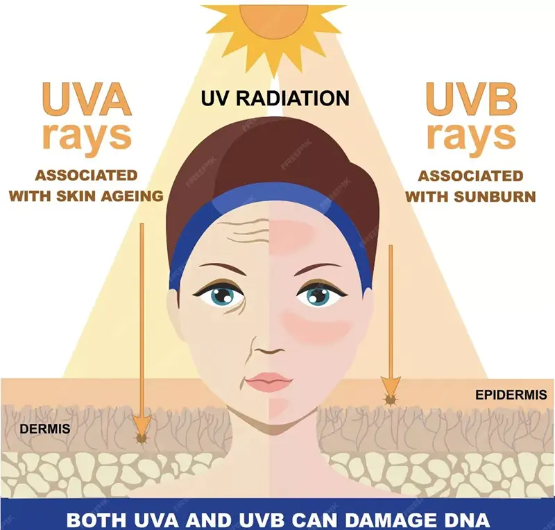 Tako UVA kot UVB lahko povzročita poškodbe kože, vendar sta njuna učinka različna predvsem zaradi globine prodiranja. Očitno lahko bogatejši UVA prodrejo globlje v usnjico in so bolj neposredno povezani s fotostaranjem, saj bodo proizvedli ROS in razgradili kolagen in elastin, kar bo povzročilo gube, izgubo elastičnosti kože in druge znake prezgodnjega staranja. Nasprotno pa UVB prizadene predvsem povrhnjico, kar kratkoročno povzroči sončne opekline (sončni eritem) in proizvodnjo melanina, medtem ko lahko dolgotrajna izpostavljenost povzroči hiperkeratozo in znatno poveča tveganje za kožne maligne tumorje.