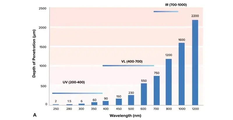 Kot je prikazano na zgornji sliki, ima vidna svetloba velik vpliv na kožo, saj ima ta pas globlje prodiranje v kožo. Rdeča svetloba lahko prodre skozi povrhnjico in usnjico ter doseže maščobno plast, kar kaže na razmerje med valovno dolžino in globino penetracije ter obratno razmerje med valovno dolžino in energijo, medtem ko ima modra svetloba večjo energijo in manjšo globino penetracije kot rdeča svetloba.